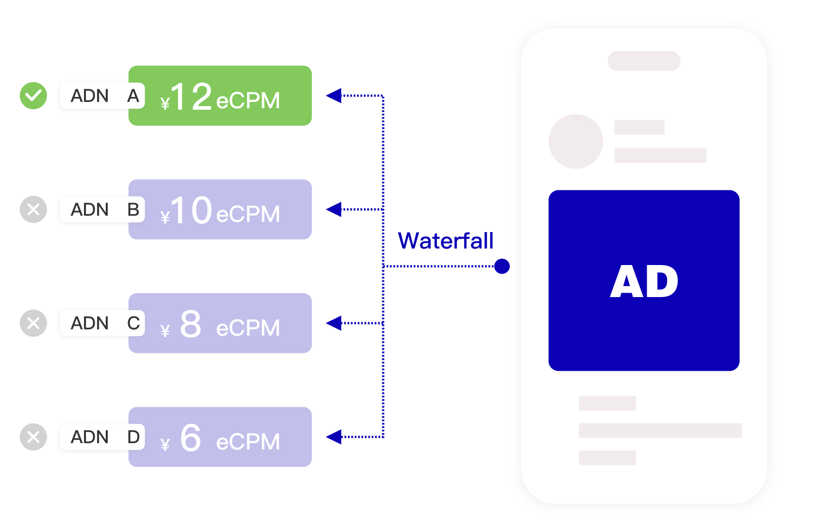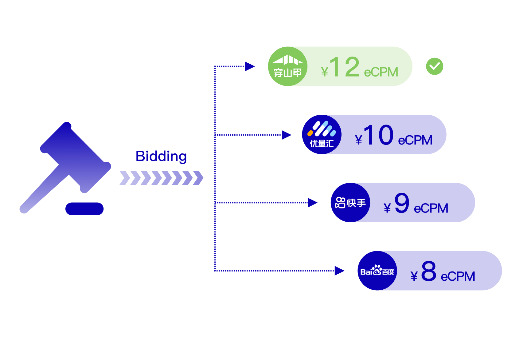 整合各大联盟等主流广告平台,通过并发竞价技术实时优选最高价优质广告,